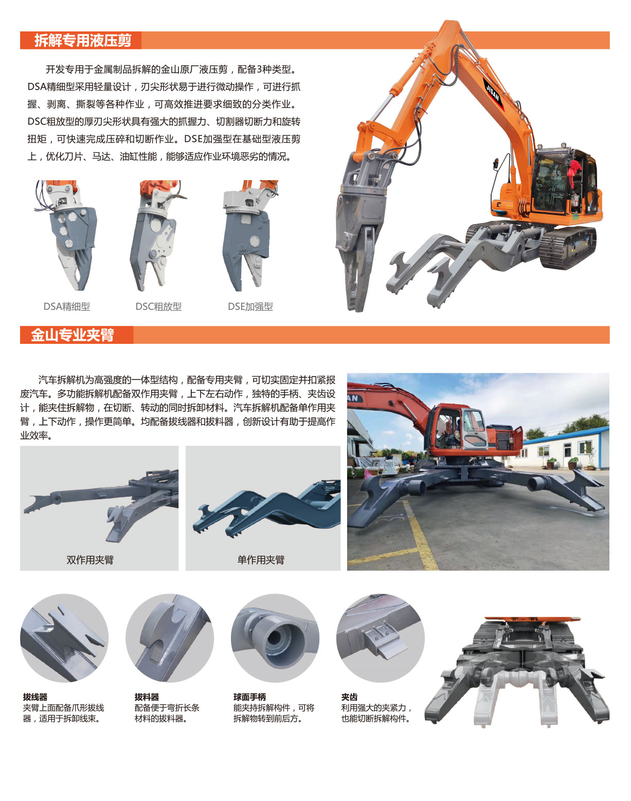 開發(fā)專用于金屬制品拆解的金山原廠液壓剪,配備3種類型。DSA液壓剪采用輕量設(shè)計(jì),刃尖形狀易于進(jìn)行微動(dòng)操作,可進(jìn)行抓握、剝離、撕裂等各種作業(yè),可高效推進(jìn)要求細(xì)致的分類作業(yè)。DSB液壓剪的厚刃尖形狀具有強(qiáng)大的抓握力、切割器切斷力和旋轉(zhuǎn)扭矩,可快速完成壓碎和切斷作業(yè)。DSC液壓剪雙開口設(shè)計(jì),效率更高。